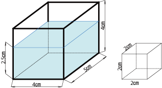 この容器に1辺が2cmの立方体をした金属を入れていきます。この